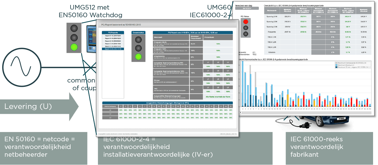 Bij overschrijving van de normwaardes kan de machine of installatie (versneld) uitvallen en zijn garantieregelingen niet meer van toepassing. Daarom is het een must voor iedere installatieverantwoordelijke (IV-er) om de spanningskwaliteit continu te bewaken, om zo een goede werking van de geïnstalleerde apparatuur zoveel mogelijk te kunnen garanderen. In nieuwe normen als de EN50600-2-2 voor de opbouw van elektrische installaties in een datacenter is een spanningskwaliteit conform de EN 50160 en de IEC 61000-2-4 een eis. De nieuwe Watchdog apps EN 50160 en IEC 61000-2-4 van Janitza bewaken continu en automatisch de spanningskwaliteit conform de EN 50160 en de IEC 61000-2-4. Een stoplicht geeft aan wanneer de kwaliteit zich in de gevaren zone begeeft of wanneer grenswaardes worden overschreden. Tevens maakt de app een eerstelijns analyse mogelijk via de geïntegreerde webserver van de Power Quality Analyser.